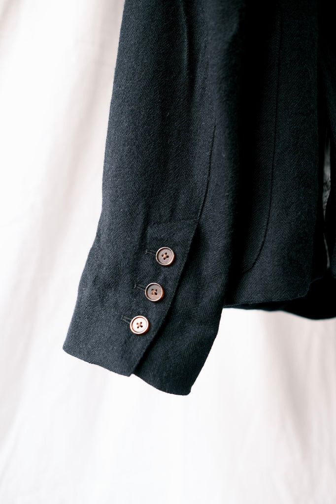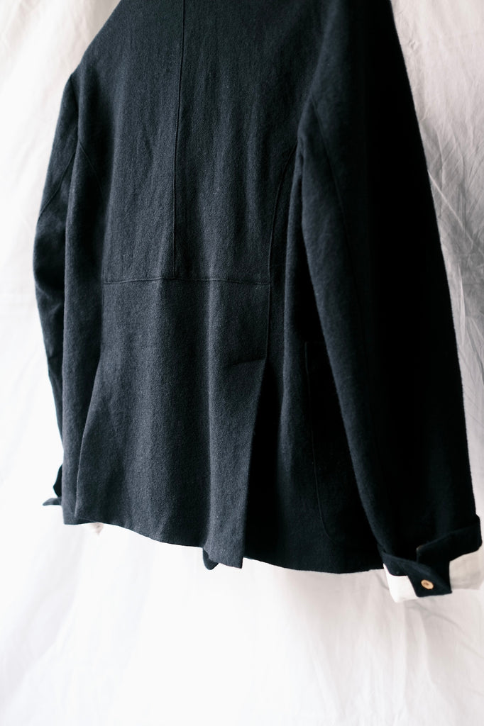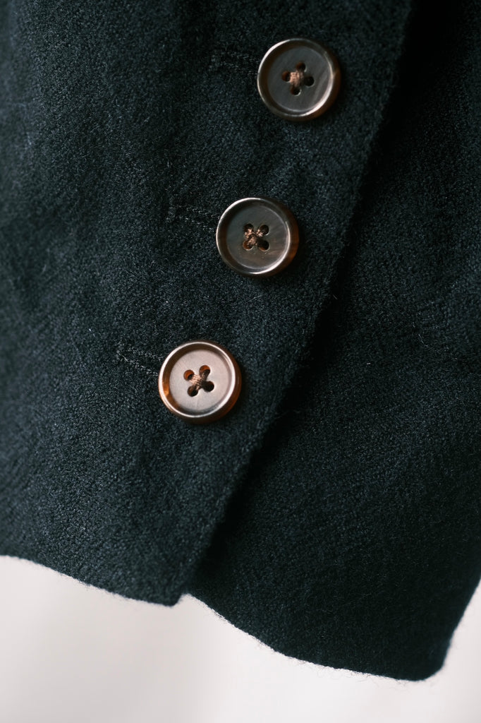 そしてアームホールの中央部分からのパネルの切り返しが入っており、それによりウエストは気持ち良くシェイプが効いており一昔前のギュンギュンに絞ったシルエットでも今のオーバーサイズでもない不変的な綺麗なシルエットになっております。