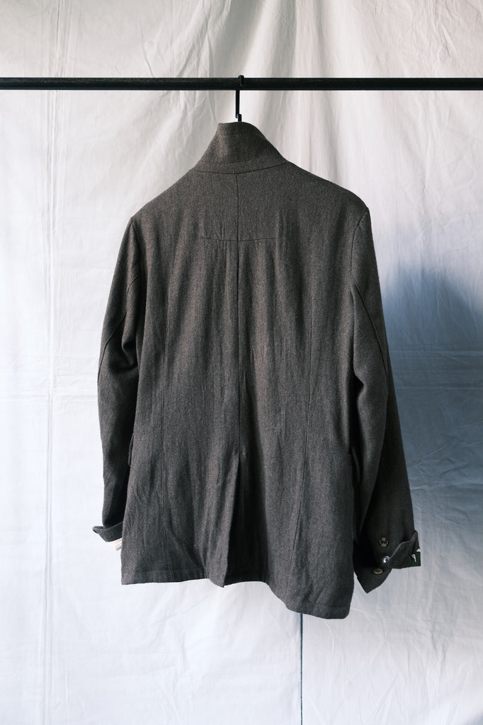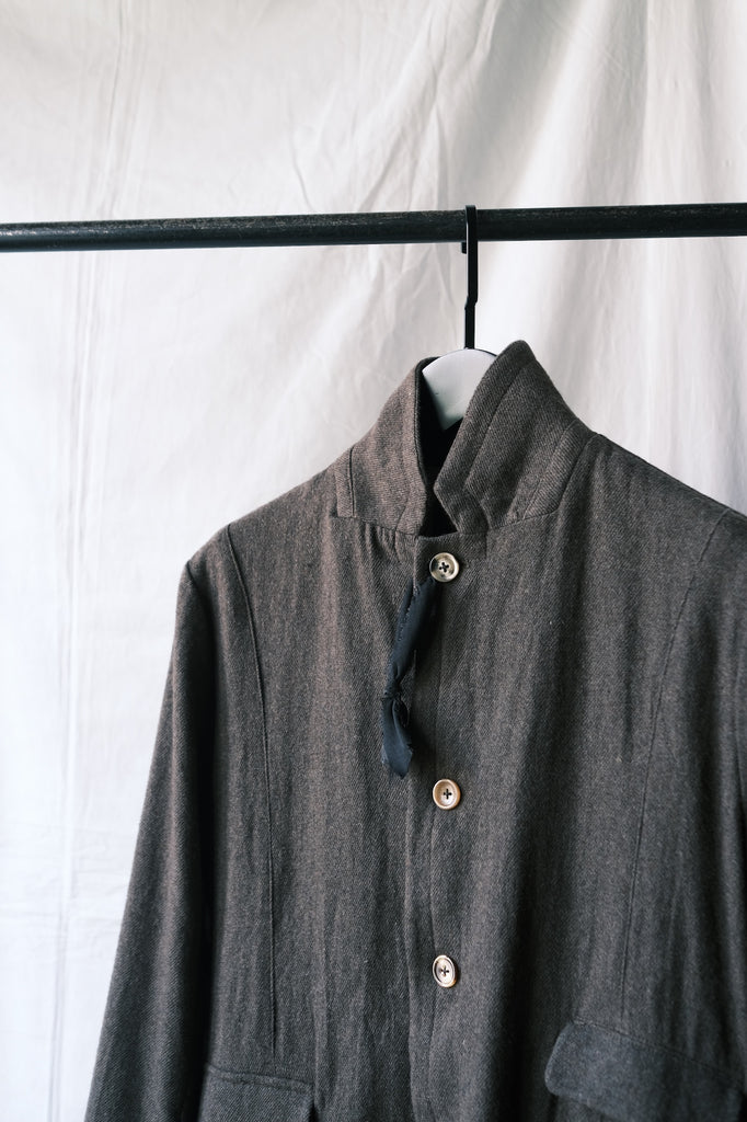 通常立ち襟と言えばシャツやブルゾンで多く見られる形状でジャケットに用いられることは多くなく、「寝ている襟を立たせて立ち襟にする」と言うのが一般的だと思います。