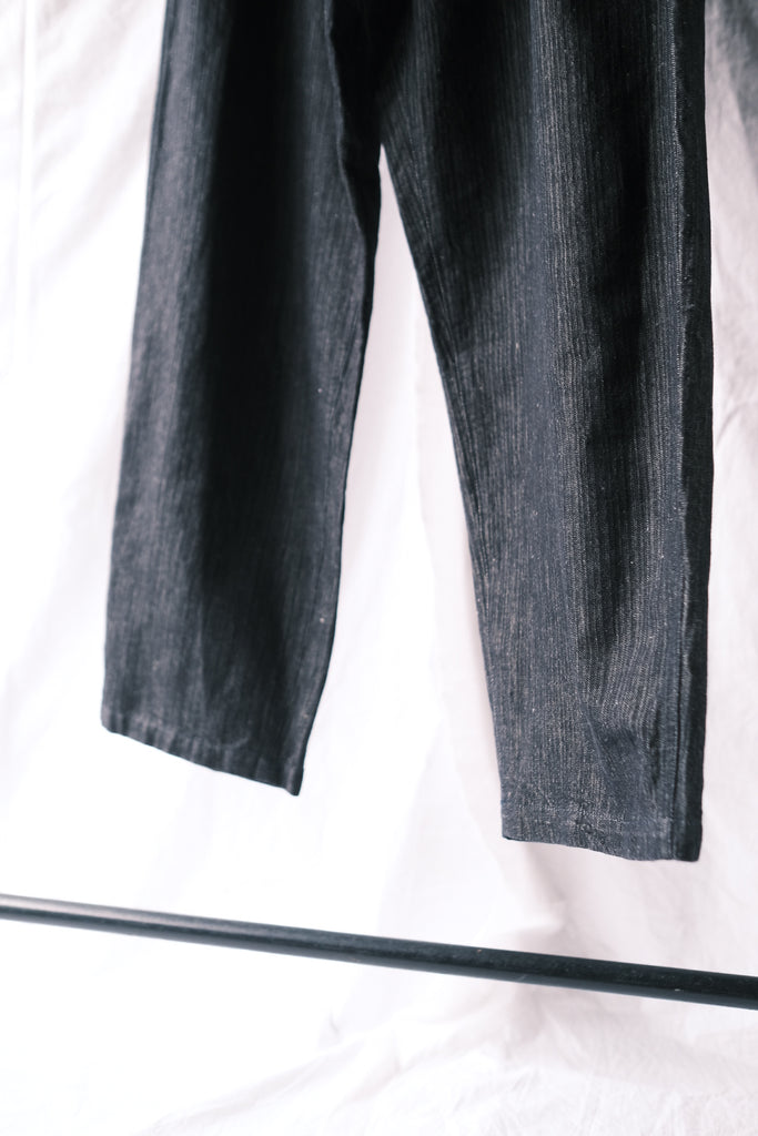 超長綿ながらナチュラルなムラ感のあるマナプール糸を経糸に使用。 緯糸には無染色のリネンを使用。経糸はチーズ染色によるインディゴ染料・硫化染料の糸染め。