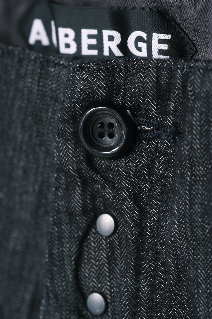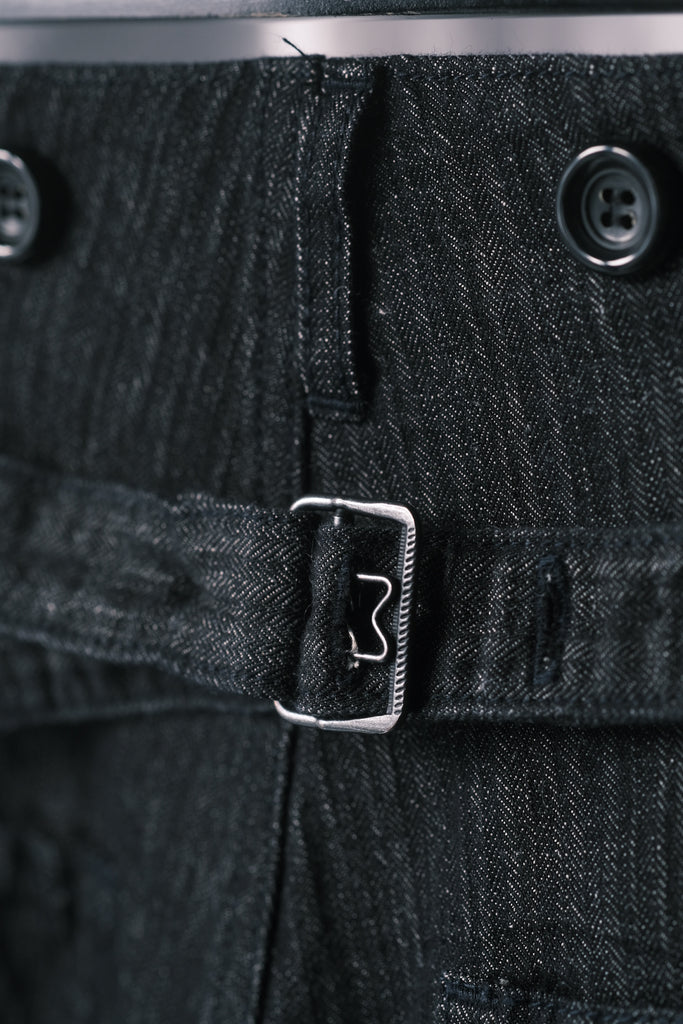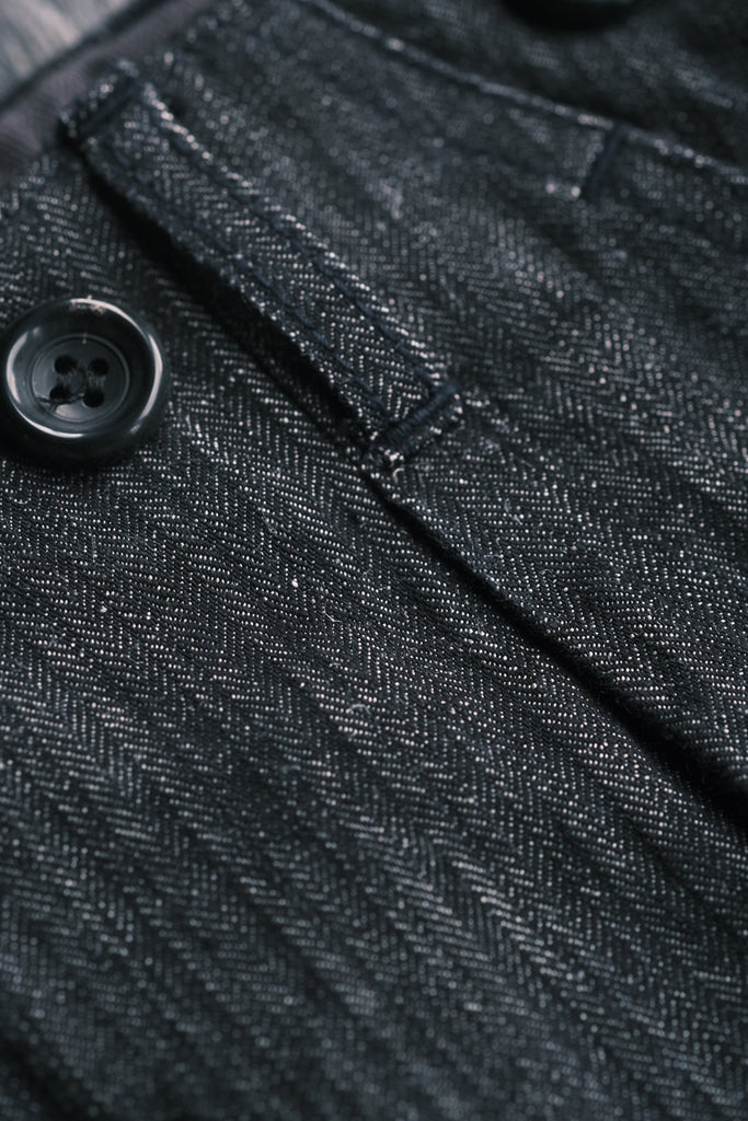 織り組織はフランス軍第一次大戦時のランダムリネンへリンボンを再現。経糸と緯糸の縮率差と、織りのテンションが大きく変化する組織の影響で洗いによってゴツゴツとした立体感がでる。