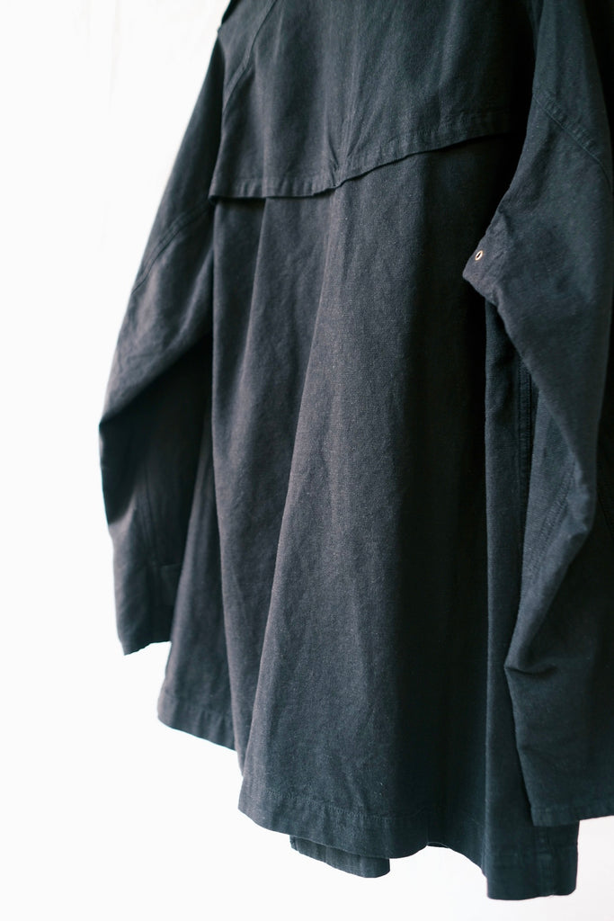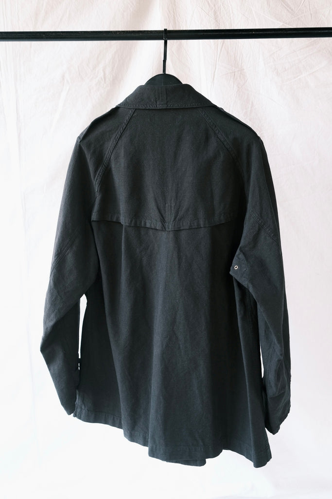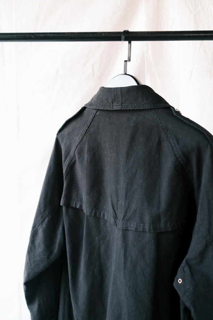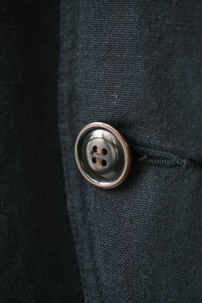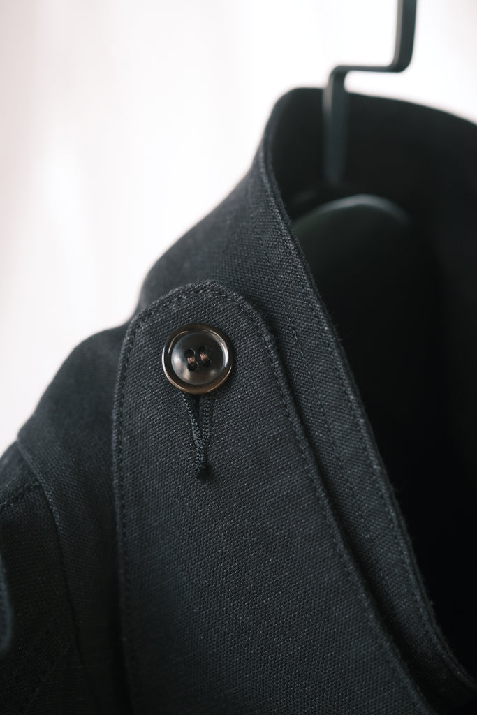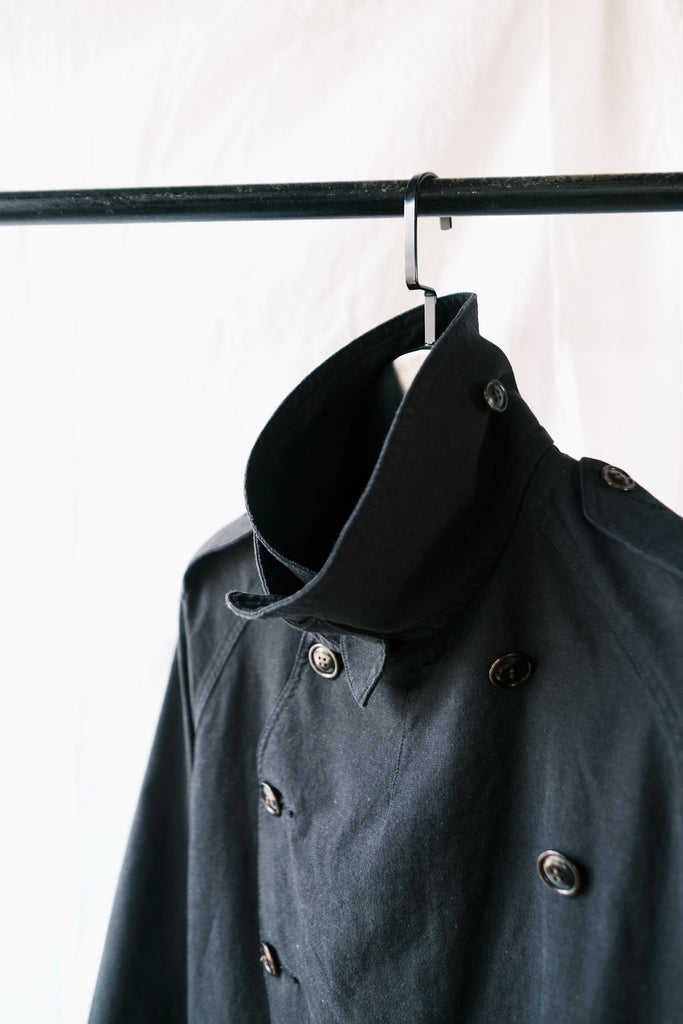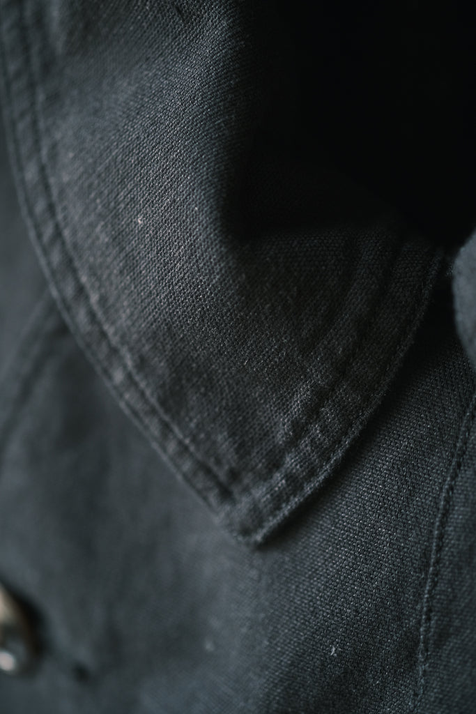 そして「大きなダブルの前端をボタンを止めずにラフに着て頂くのがおすすめです」この1文のように丈夫さを求め硬く作られた生地にはない着こなし、そして雰囲気を纏っております。