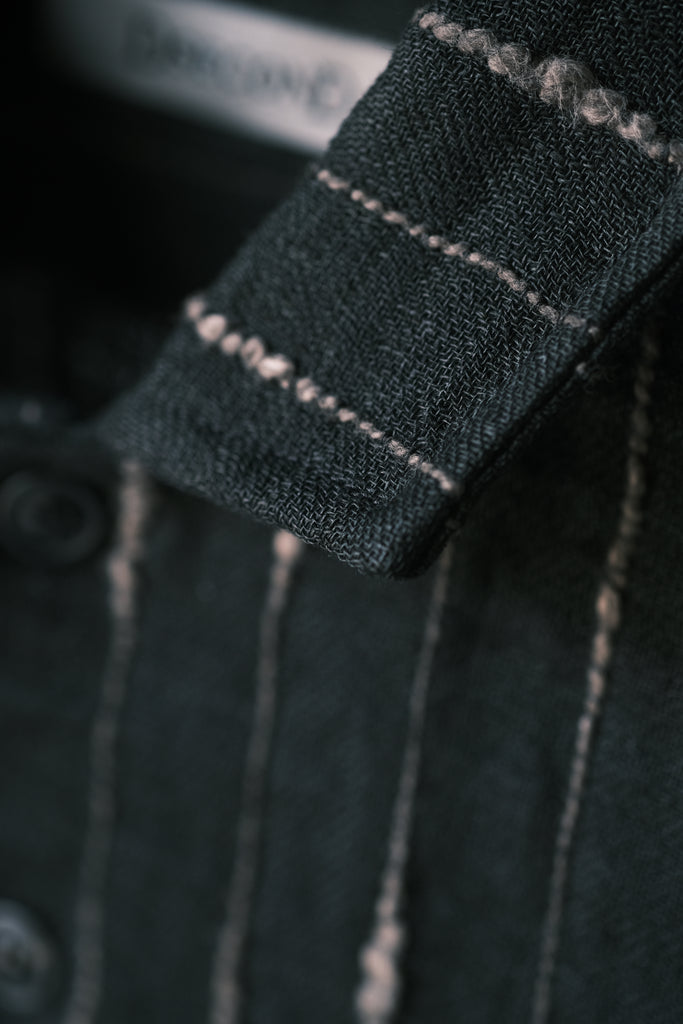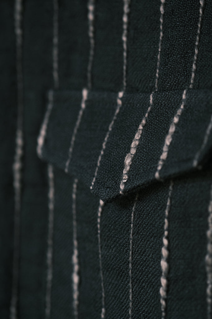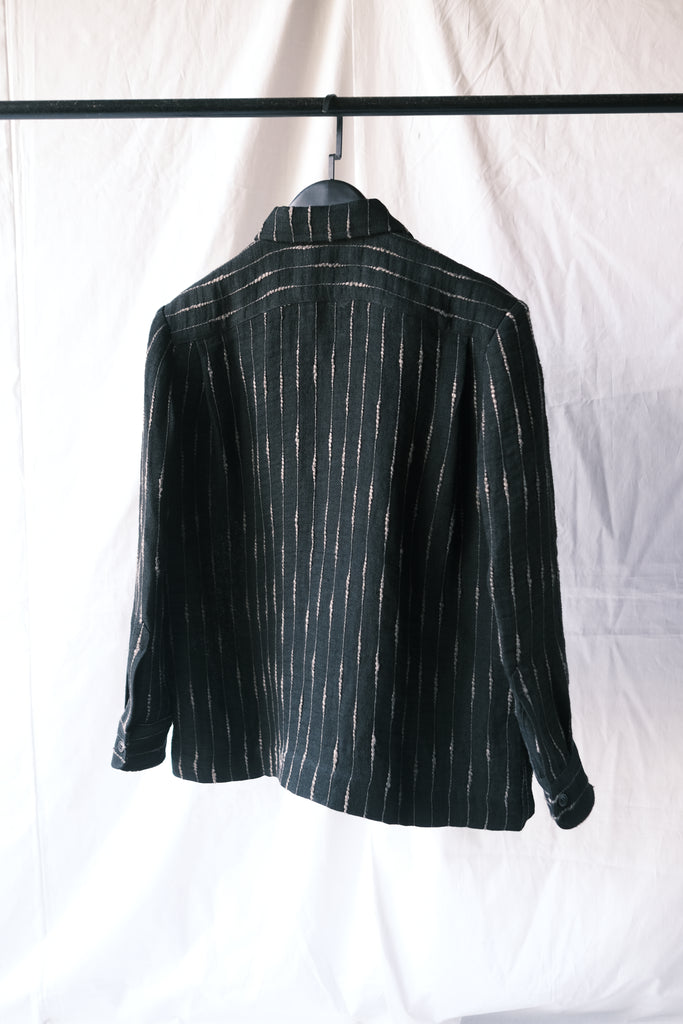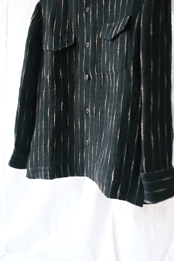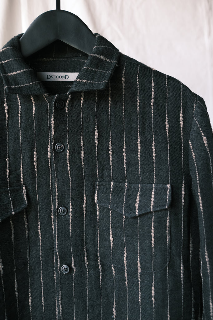 ガーゼやメッシュに近いリネン素材に糸ムラの激しいコットンでストライプを表現したイタリアで織られた生地を使用したCPOシャツ、通称Double Pocket Shirt