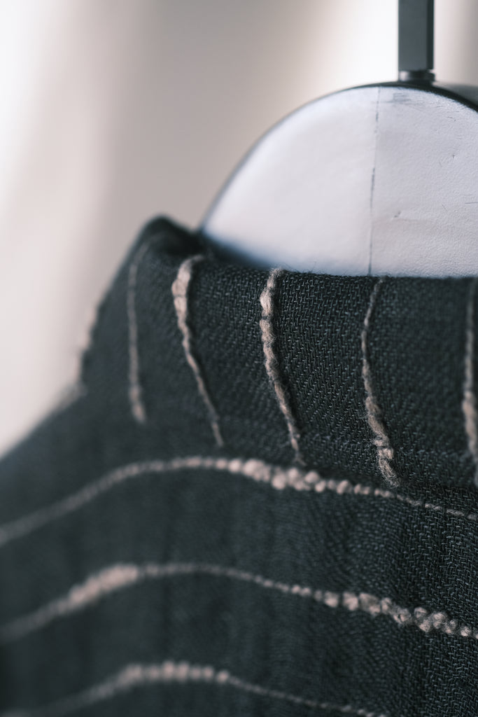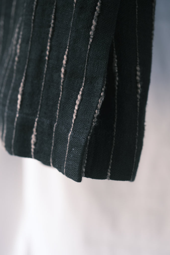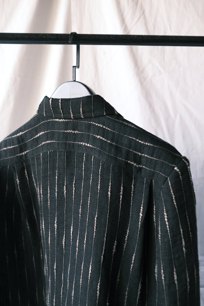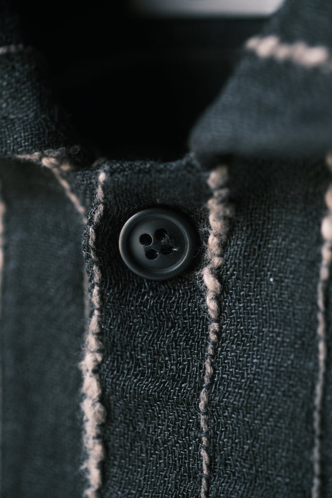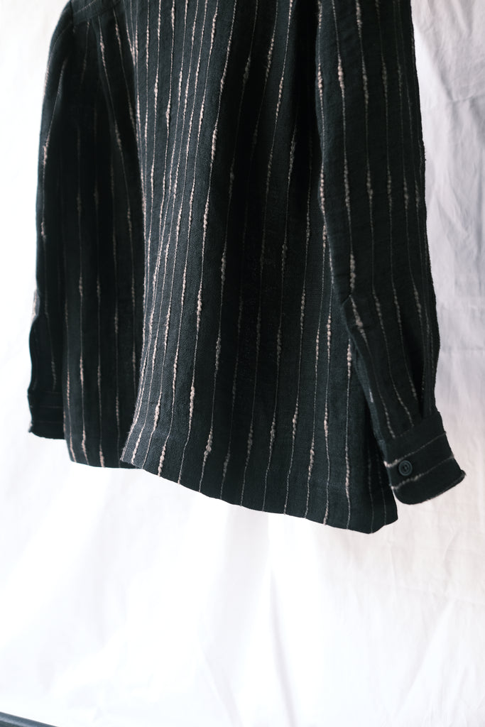 ガーゼやメッシュに近いリネン素材に糸ムラの激しいコットンでストライプを表現したイタリアで織られた生地を使用したCPOシャツ、通称Double Pocket Shirt