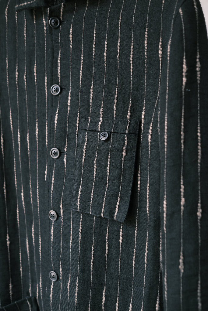 ガーゼやメッシュに近いリネン素材に糸ムラの激しいコットンでストライプを表現したイタリアで織られた生地を使用したロングコート。