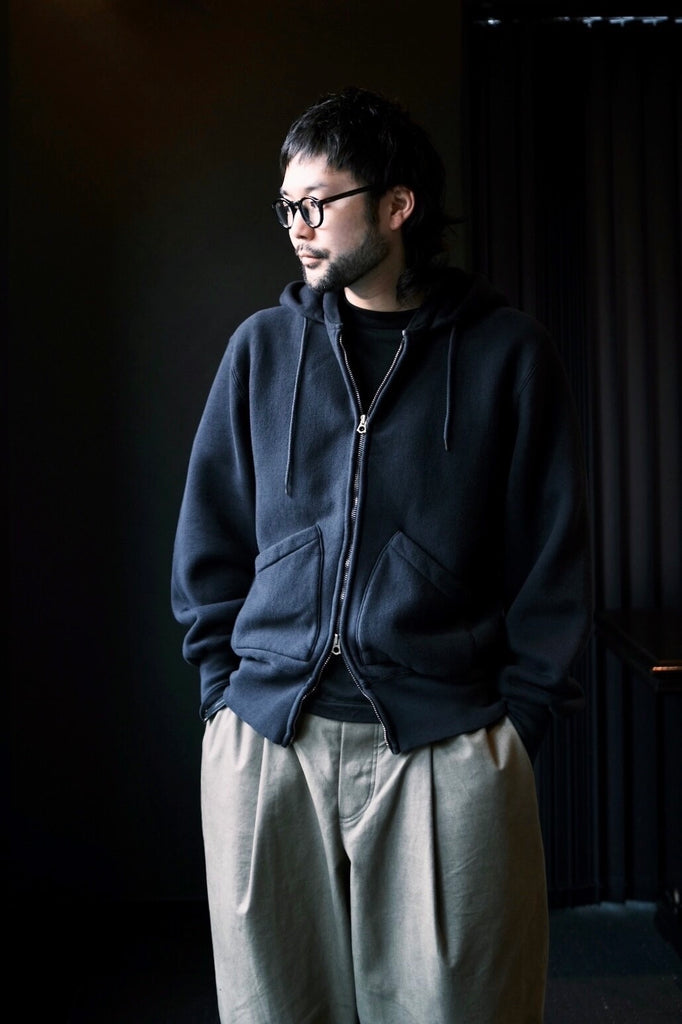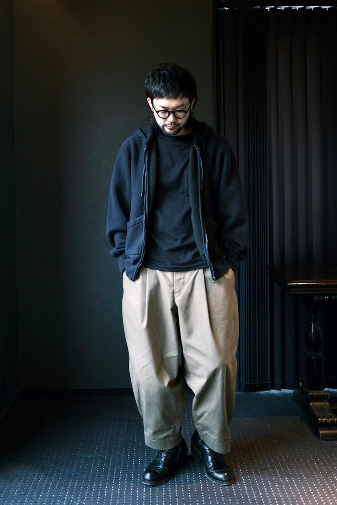 着てみると裏側のシルクがボアのようになっているので一般的なパーカーよりもアウター感覚で使える1枚かなと思います。