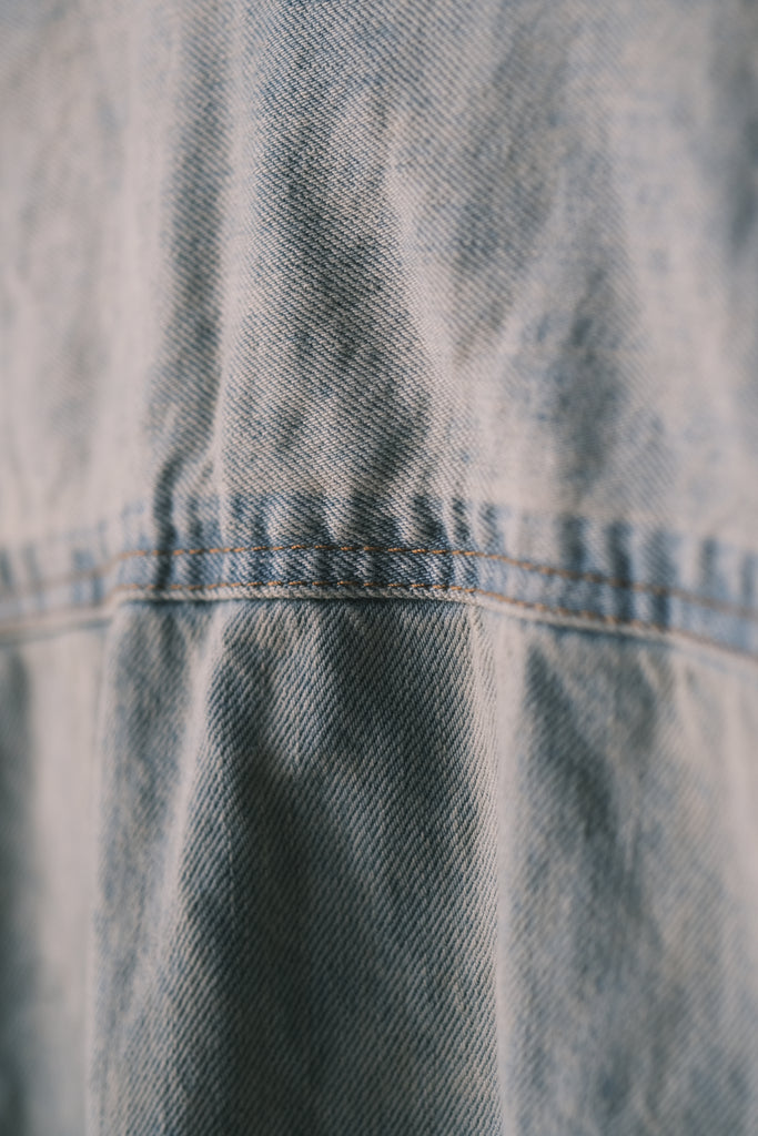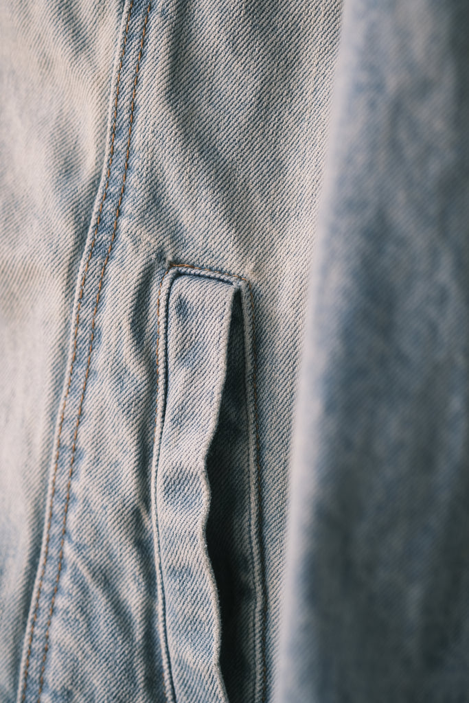 インディゴブルーをかなり薄くなるまで落としているのですが、どこかベージュや緑がかった色合いになっており所謂古着のデニムとは違った色合いになっています。