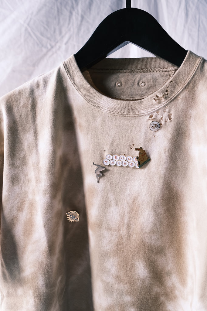 ただ簡単に説明するならばコットンの天竺をタイダイ染めし、首元にダメージ加工を施しピンズを散りばめた。そんな感じでしょうか。