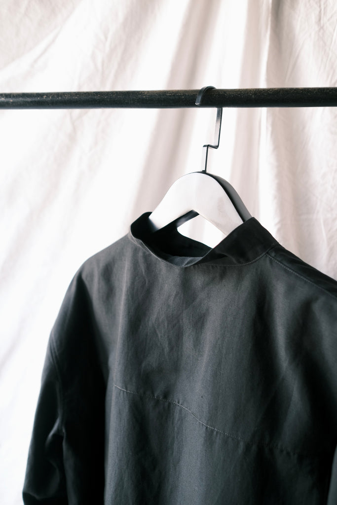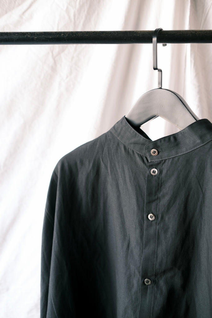 ハンガーに掛かっているだけだと至極シンプルなバンドカラーシャツなのですが、着ると全く違った表情になる1枚。