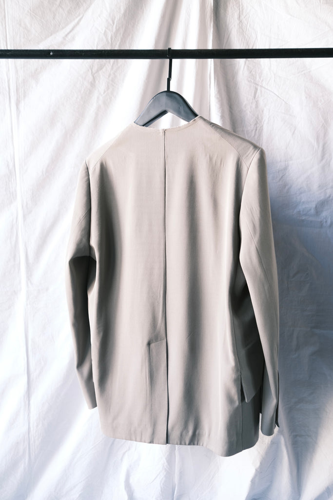 フロントの断ち切りの具合や極限までミニマライズされたデザインなど、ぱっと見はシンプルなノーラペルジャケットと思ってしまいますが実は相当な拘りが詰め込まれた1着になります。