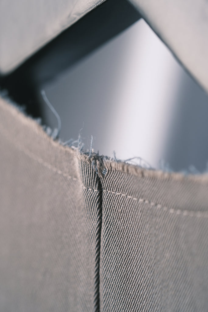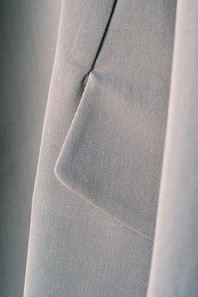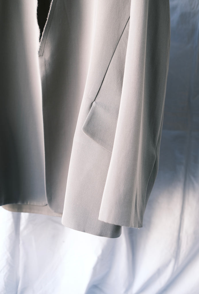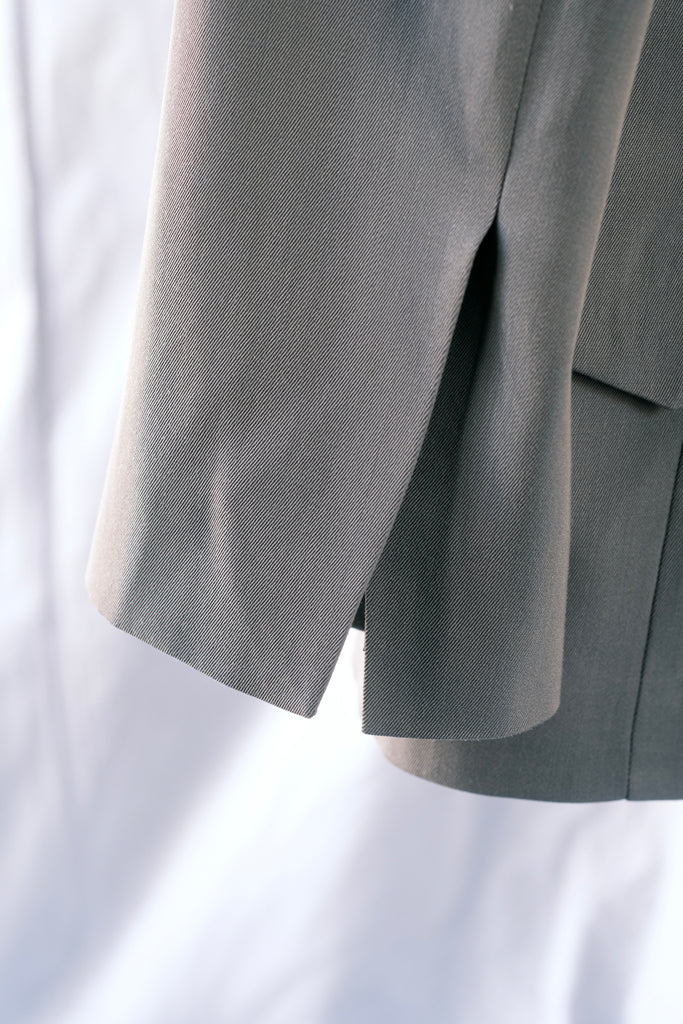ラペルが付いている部分は断ち切りによって省かれ、袖口にはボタンもなくスリットがあるのみ、ステッチなどもほぼ掛かっておらず至極シンプルなデザインになっています。