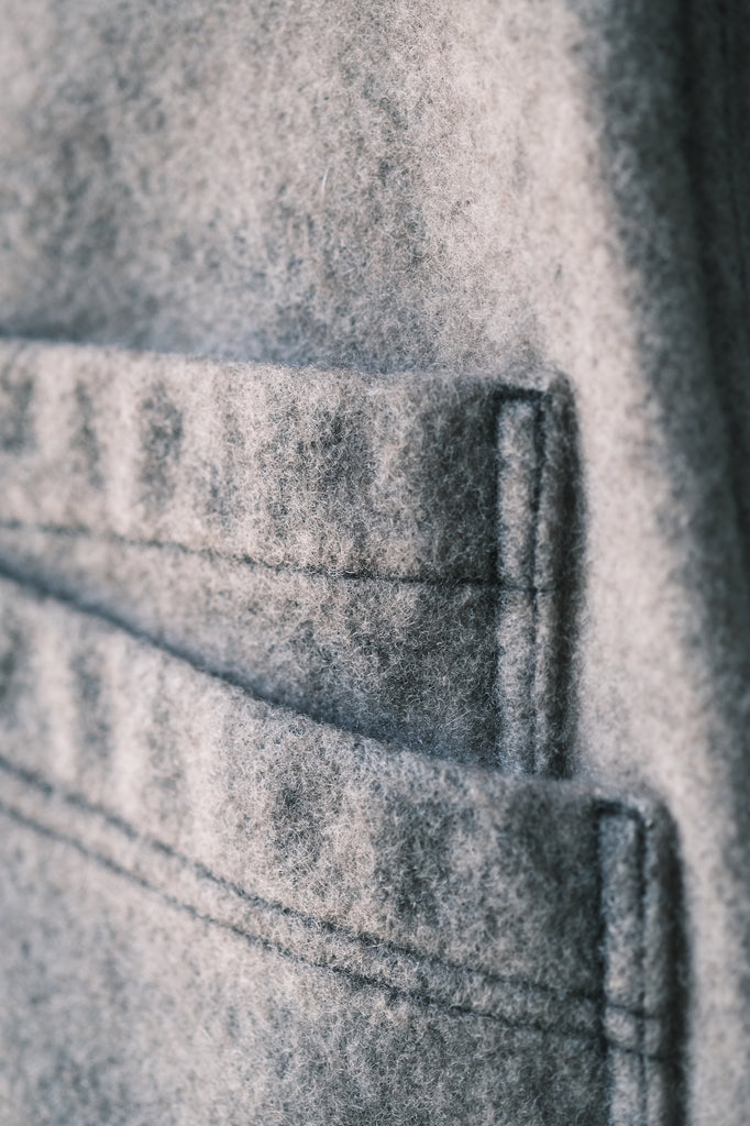 そちらにウール素材を当て込んでいるわけですが、元々は現物よりも130%ほど大きい作りになっておりそれを強縮絨させることでメルトンのような厚みを持たせています。