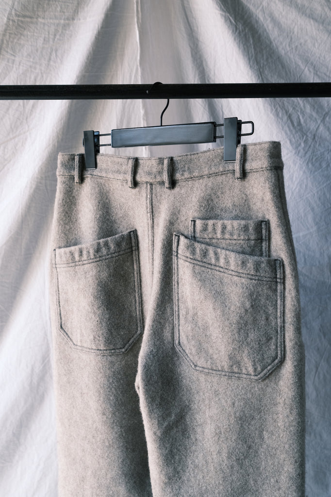 その時はブラックのヴィンテージメルトンに白いエアブラシを吹きかけ、着用するたびにエアブラシが落ち更に油分を含んだメルトンがツヤを増すというBenjamin Buttonのように若返っていくようなパンツを作って頂きました。