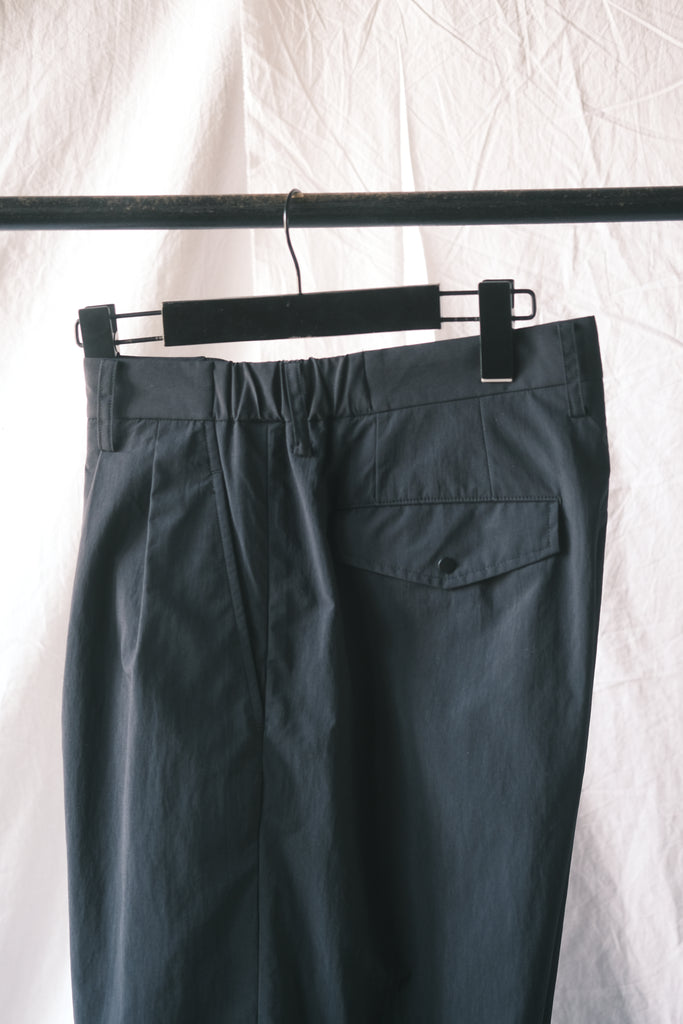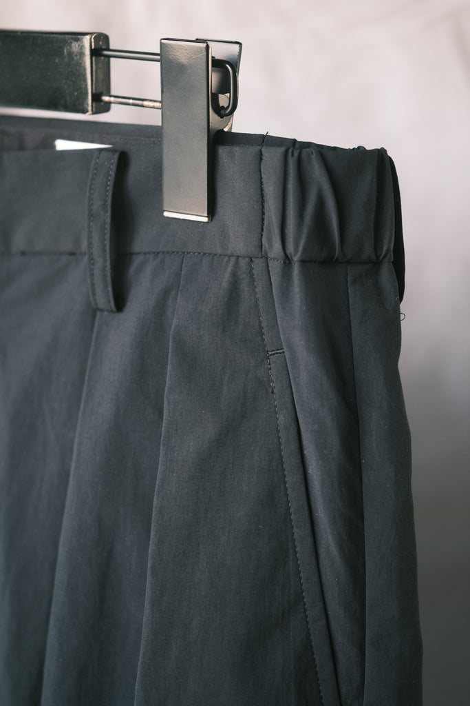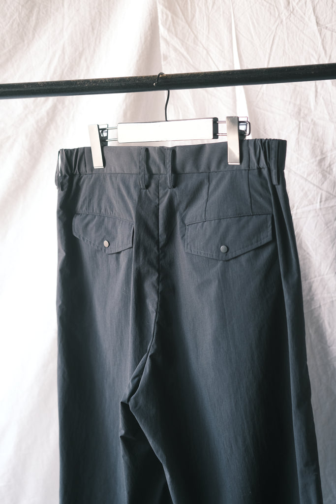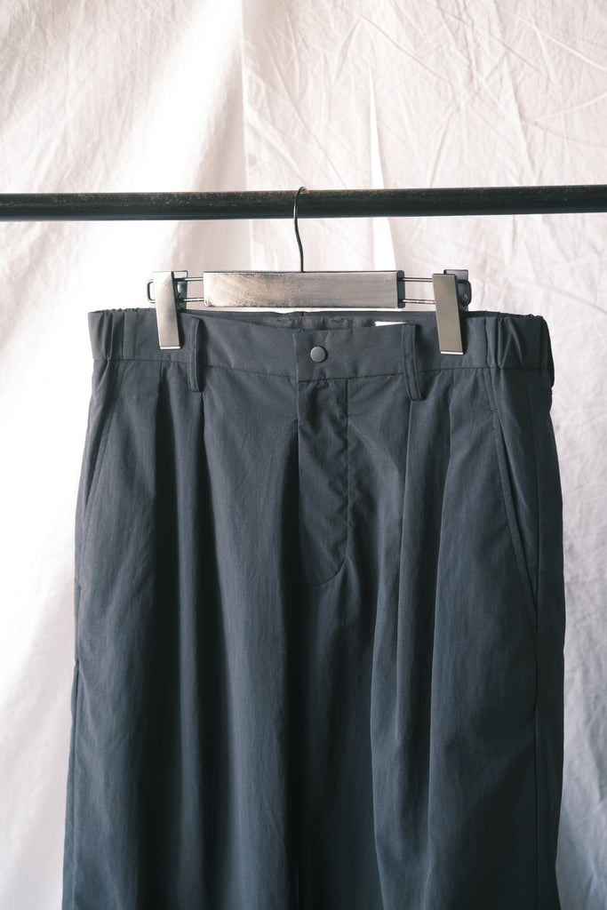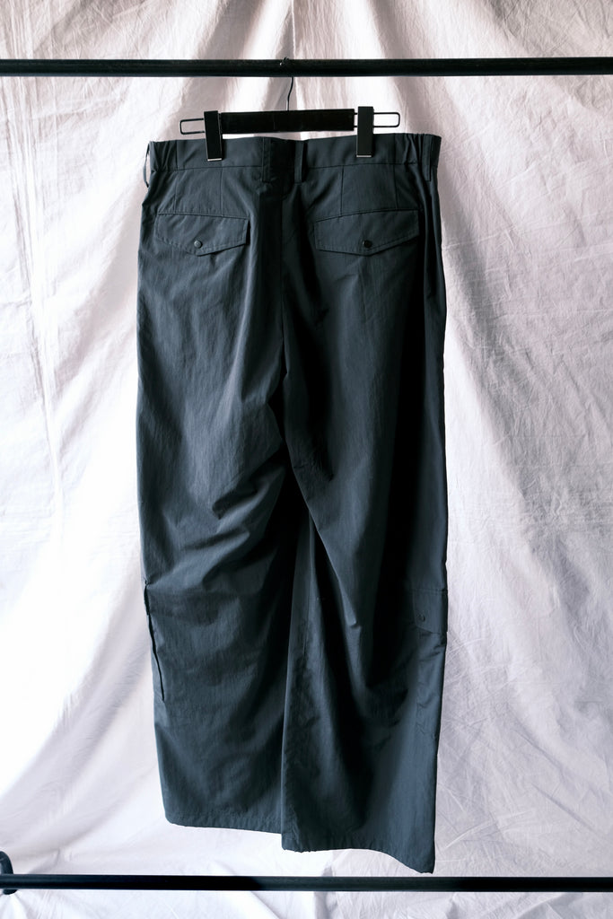 強撥水のナイロン素材を使用した、カーゴポケット付き2タックワイドストレートパンツ。