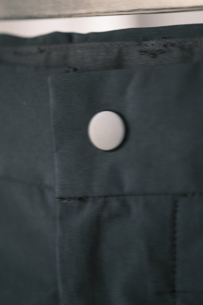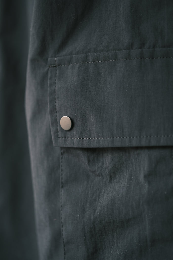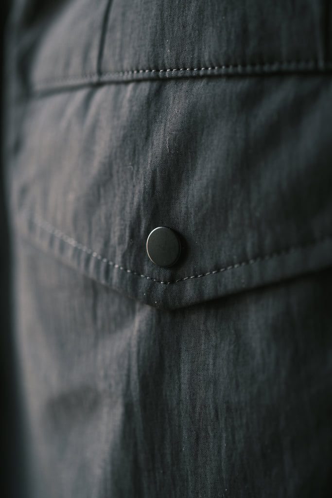 裾口に配置された、共布のドローコードでシルエットを変化でき、脇にゴムも配置されウエストでも腰の位置でも着用できます釦はオリジナルのマット塗装のドット釦を使用。