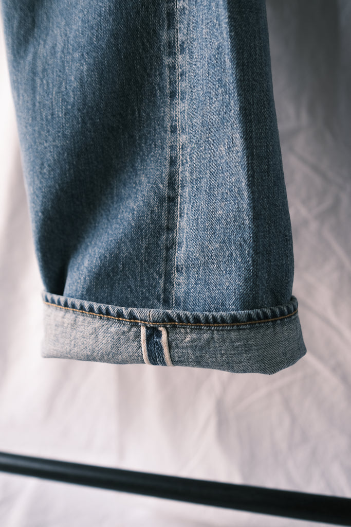 デザイナーの牧さんが所有しているヴィンテージデニムを2本掛け合わせた作品なのですが、そこから更に腰回りや渡り幅、丈を調整し現代の日本人に合うようなシルエットに変更。
